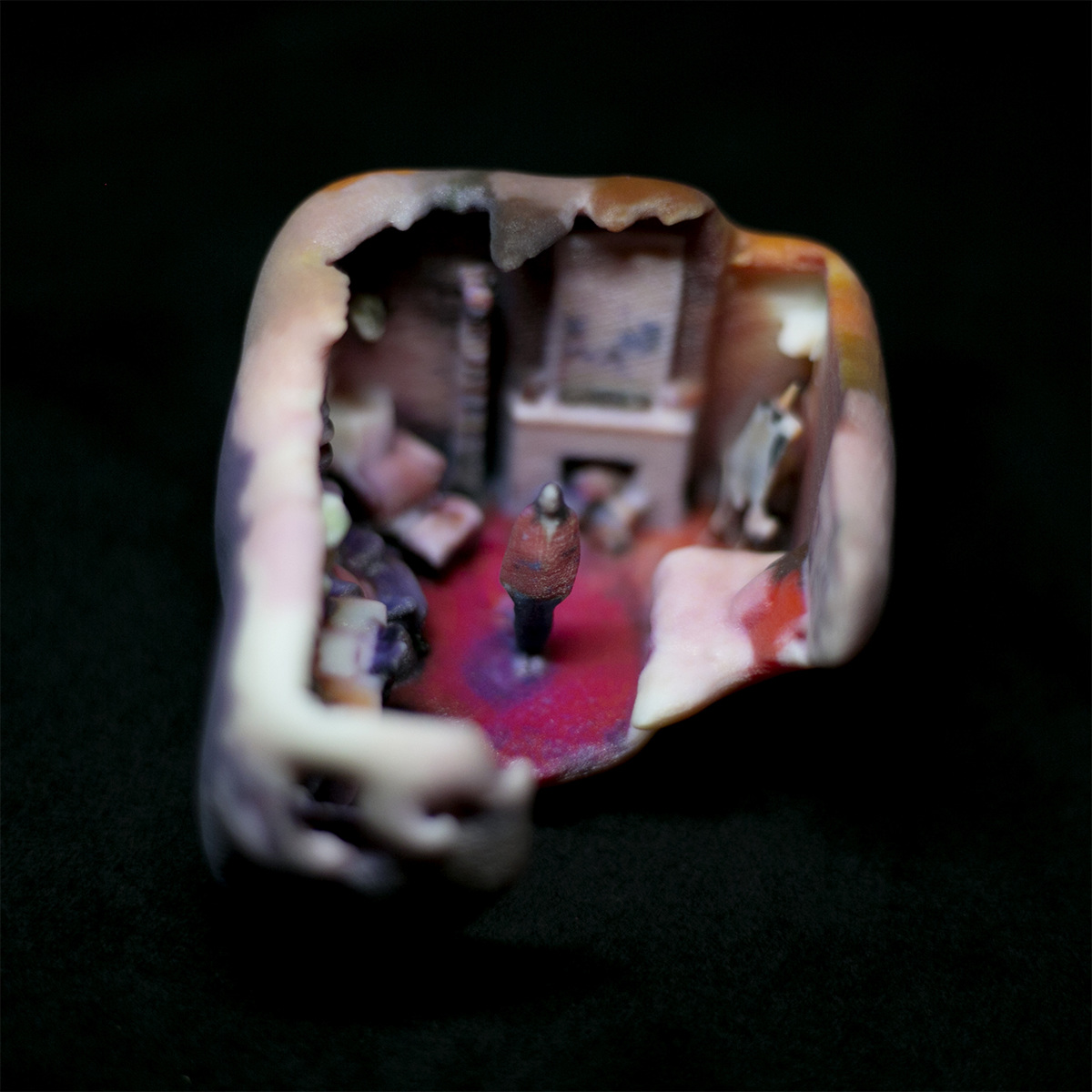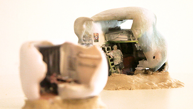 The physical replicas of the habitats are created through additive manufacture with a Stratasys J750 printer. The 3D prints are made of thousands of layers of a liquid photopolymer which is cured under ultraviolet light. This photopolymer is an acrylate plastic, and is predicted to retain its structure indefinitely.