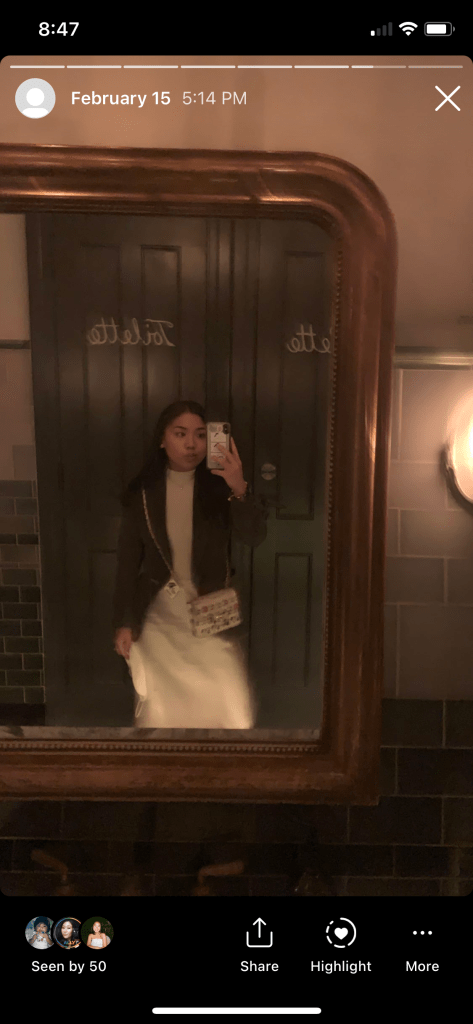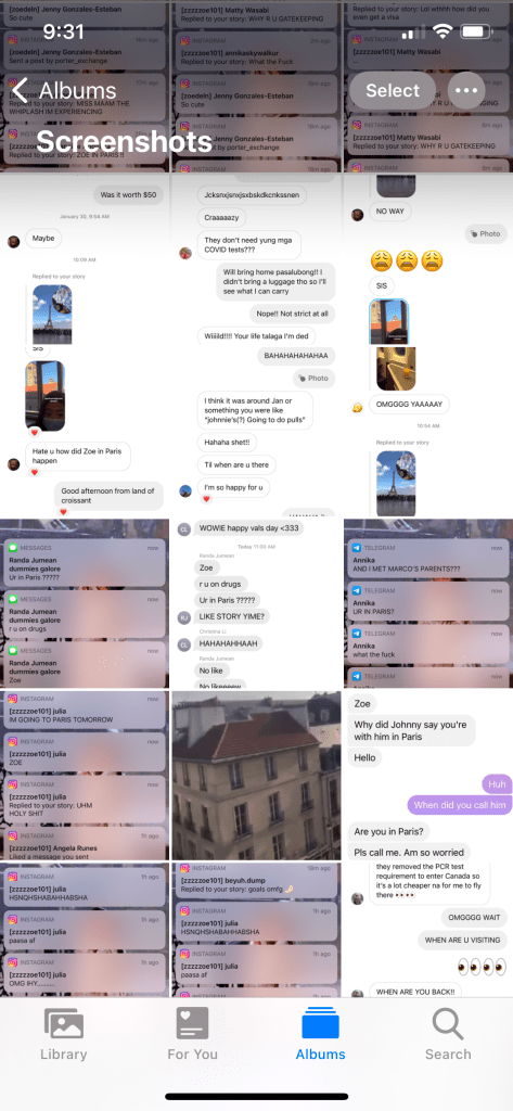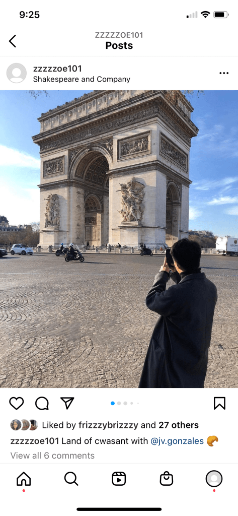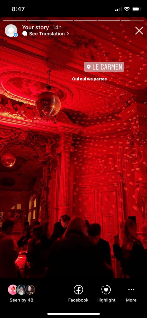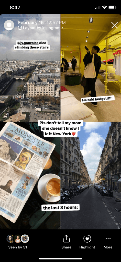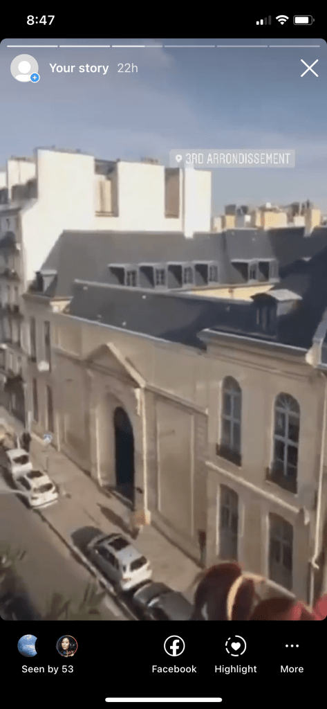I went on a fake spontaneous trip to Paris and documented the ‘experience’ on my finsta. I developed a narrative that made sense (a spontaneous night flight to see my cousin), edited a bunch of content, and got the few people who knew the truth involved (my roommate, my friend based in London, my friend here in NYC, even my work colleague).