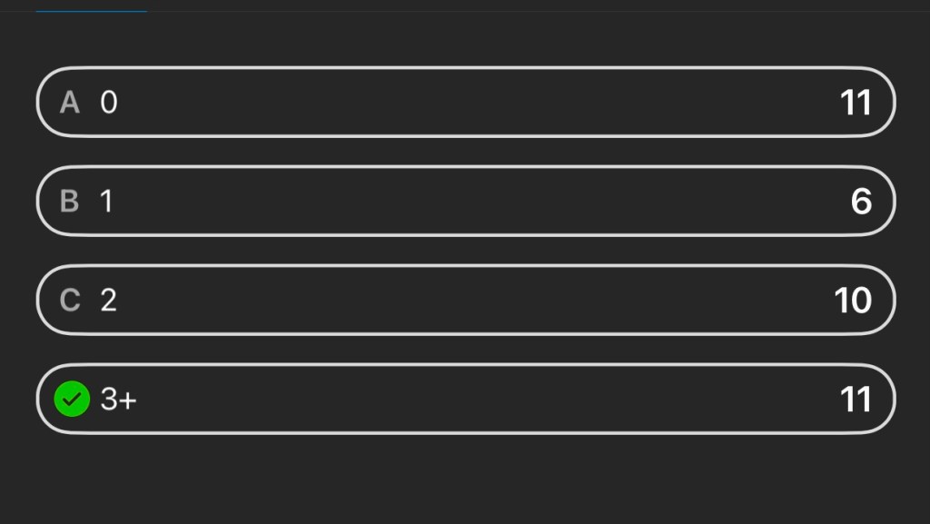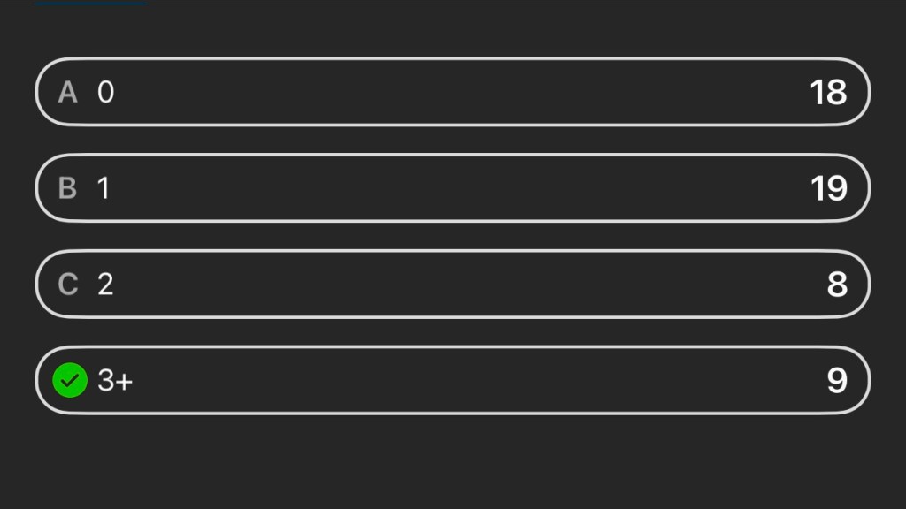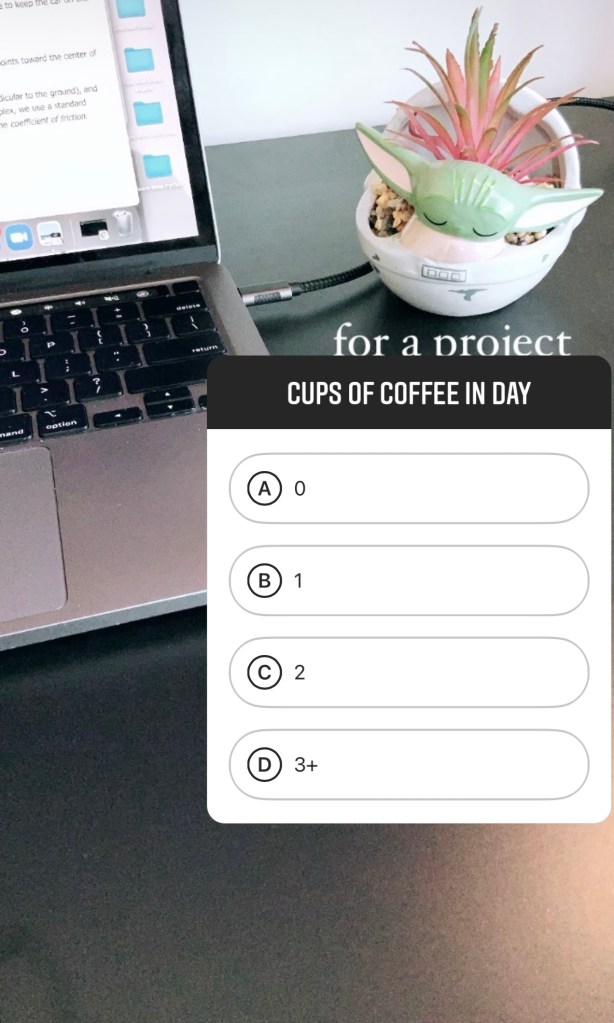 I then created an Instagram poll asking for the number of cups of coffee and tea people would drink in a day. Although not everyone on my Instagram is in college, the vast majority is in the group.