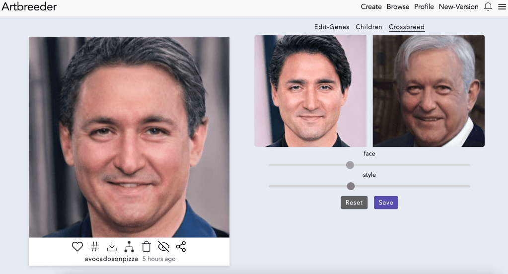 Before I started using any ML tools to process images I had to determine how to give weight to countries and in a sense power. To do this I looked at each continent/region’s nominal GDP. At first, I wanted to use inflation-adjusted GDP but I couldn’t easily find it for all countries. Doing this I then found the top 4 GDP’s of each continent and merged their political leader’s faces using the Artbreeder tool. When doing so, I adjusted their features to be mixed according to their GDP; the more dominant the GDP (I made a percent of the country’s GDP compared to the continent’s GDP) the more dominant the features. (link to the google sheets)