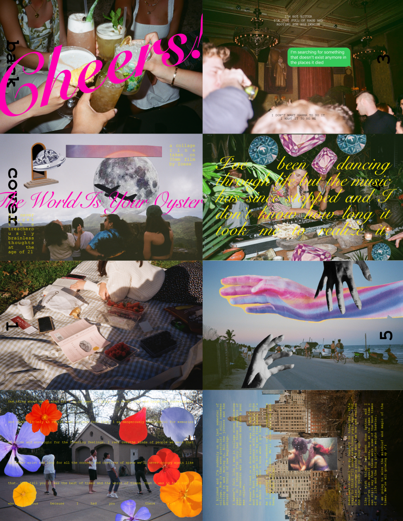 Using some of my favorite photos I’ve taken on film as a springboard for my thoughts, I made a little zine! The page count at the bottom indicates how the paper will be folded and can be edited out. I used found images to collage my photos and played around with text. I wish I stuck to a clearer theme, but I like the overall chaotic feel of it as it’s just a bunch of thoughts I’ve been having lately and I think the messy visual aesthetic aligns with the clutter of thoughts.