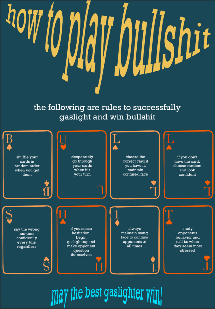 I made a tutorial on how to win the card game, bullsh*t. It’s supposed to highlight how the premise of the game is to not get caught lying. I chose to do a dramatic tutorial/instructional on how one can win when playing the game.