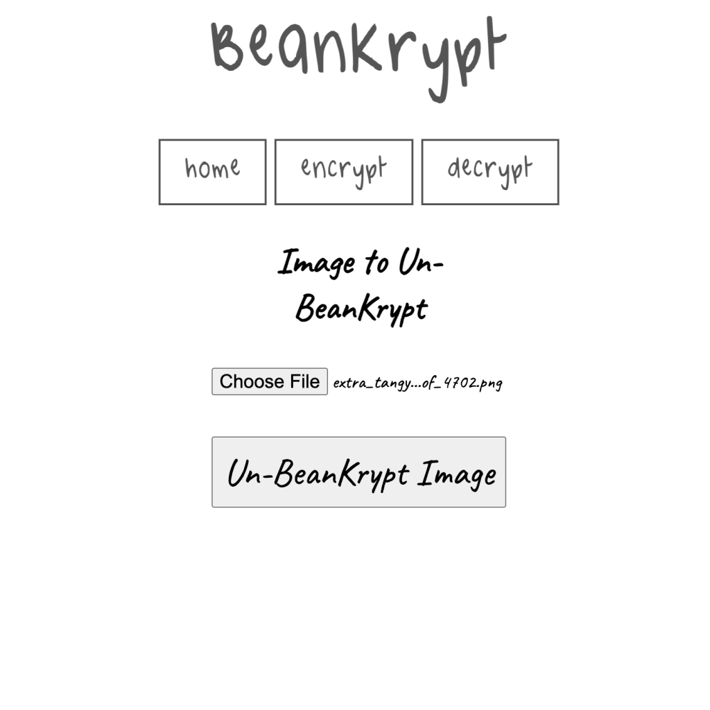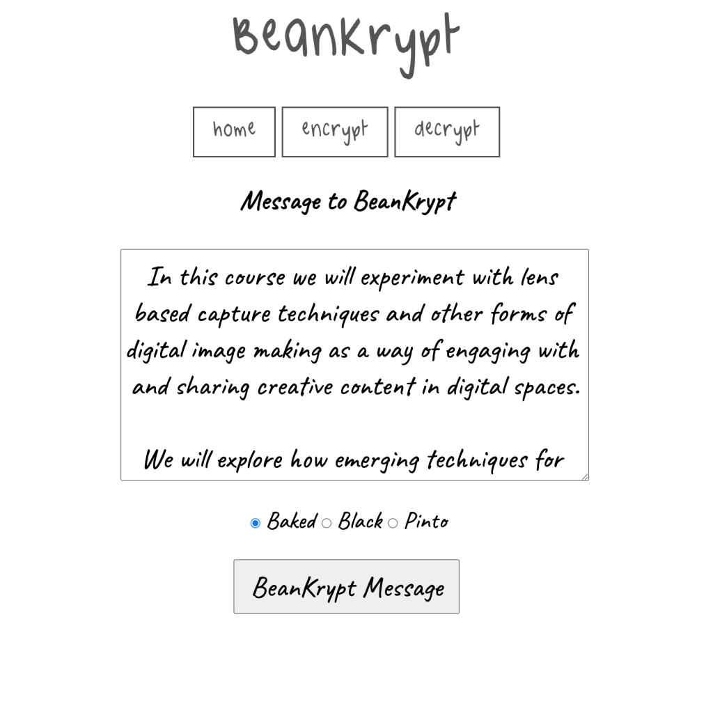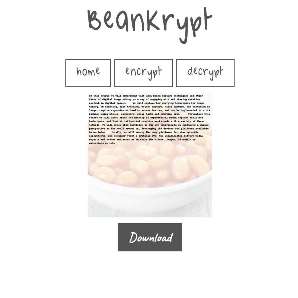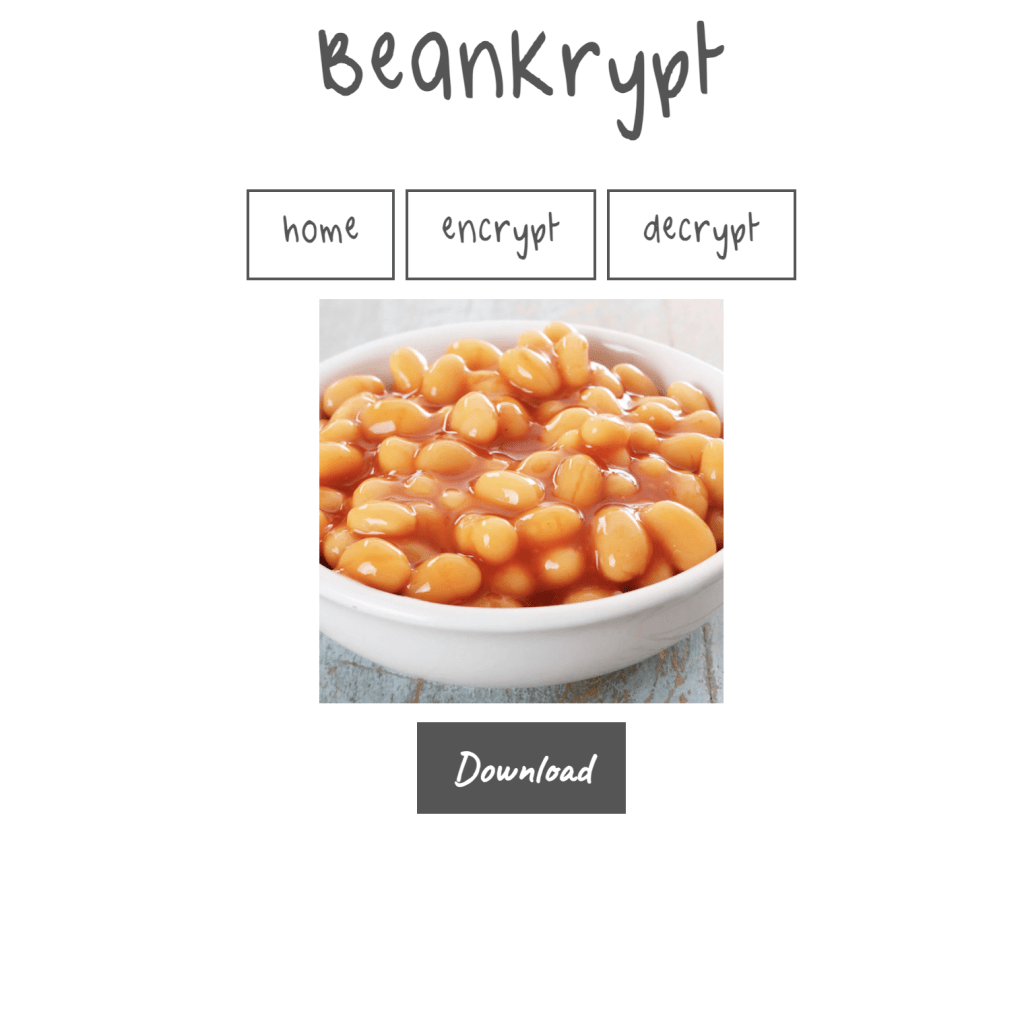 BeanKrypt is a web-app made using Python + Flask, and deployed on Heroku. It was inspired by KardashianKrypt. It allows you to encode a text message into a photo of beans (baked, black, or pinto). It works by setting the red-value of a pixel to either even or odd to encode data. This idea could be expanded to the green and blue values as well, which would allow you to encode 8 different values per pixel.