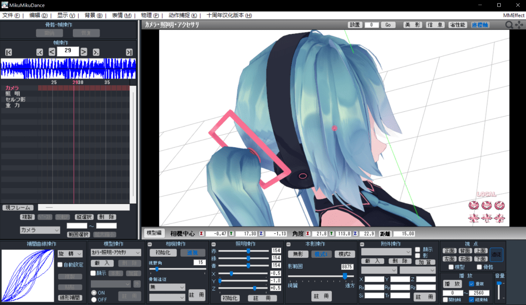 Here’s some screenshots from the MMD software while I was creating the project. Although the figure and the dancing data isn’t created by me, I still need to input the camera movement data myself, which is probably the hardest part. lighting effect like rays and textures also needs to be adjusted and rendered manually.
